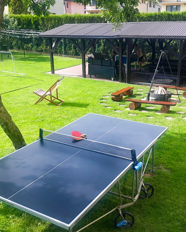 Rozległy teren zielony z altaną, miejscem na ognisko i grill, boiskiem, stołem do ping-ponga i piłkarzykami.